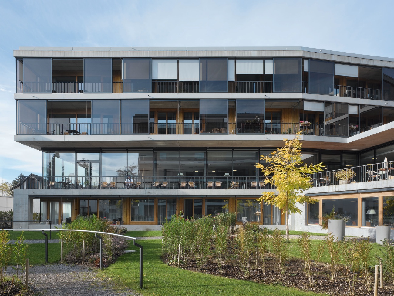 Our first residential and care centre was completed in 2010 and was honoured with the Age Award as the best senior centre in Switzerland. The site offered ideal conditions: a central location near the train station, with views of Lake Zurich to the south and vineyards to the north. We wanted everyone to benefit from this location. We designed an angled building with two equal-length wings, giving all rooms and main areas a southeast or southwest orientation – offering lake views without direct southern sun exposure. A terrace layer in front acts as a natural sunshade (brise-soleil), filtering the intense light while allowing outdoor use. This keeps the building cool in summer without complex technical systems.
