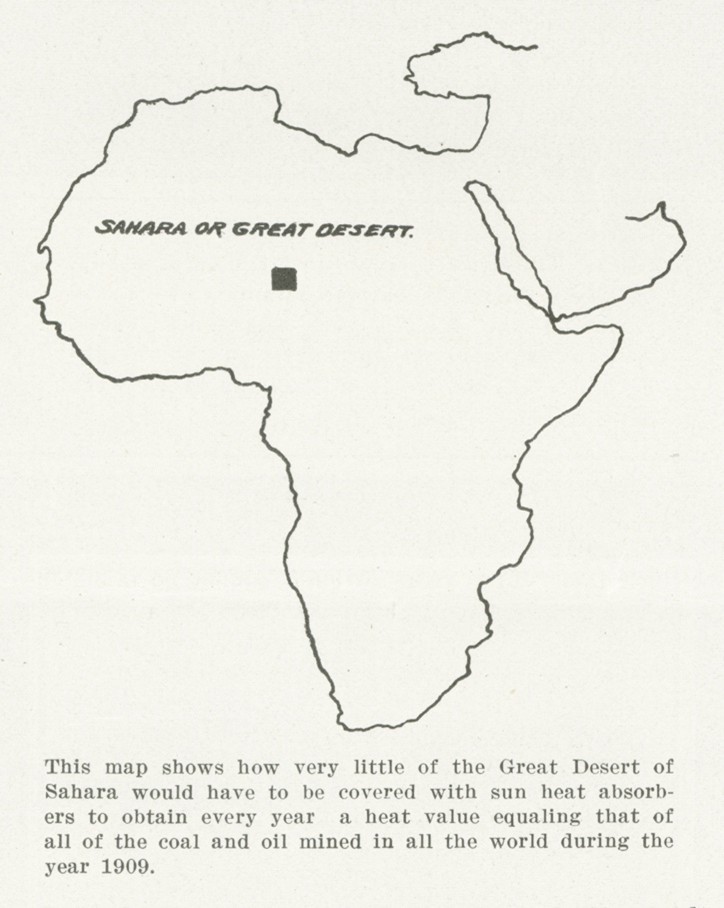 After the nomination by the Federal Office of Culture to represent Switzerland at the Cairo Biennale, we researched the exact location of the former solar power station with the help of a local historian, reconstructed a segment of the solar concentrator and wrote a short story with Egyptian author Wageh George about the construction and inauguration of the avant-garde solar power station [1]. This story, which was available to take away during the exhibition in the form of a Reclam-style booklet, contains an illustration that Frank Shuman published in Scientific American in 1914. The picture shows the African continent with a small square in the Sahara corresponding to the area that would have been needed at that time to supply humanity with solar energy. Similar illustrations were published again in 2009 by the Desertec Foundation, co-financed by the Club of Rome [2]. Although the square covers a larger part of the Sahara, it is still relatively small.